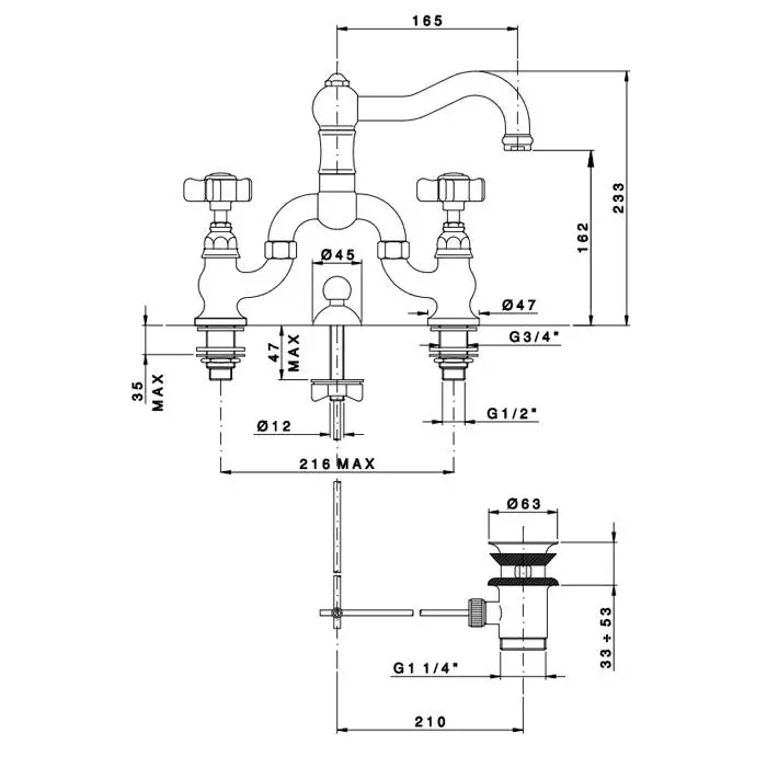 Nicolazzi Dames Anglaises Смеситель для раковины на 3 отверстия, с донным клапаном, межцентр: 216мм, цвет: хром