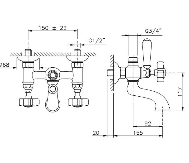Nicolazzi Dames Anglaises Смеситель для ванны, на 2 отв, с переключателем ванна/душ, вывод сверху 3/4, цвет: Bronze Plated
