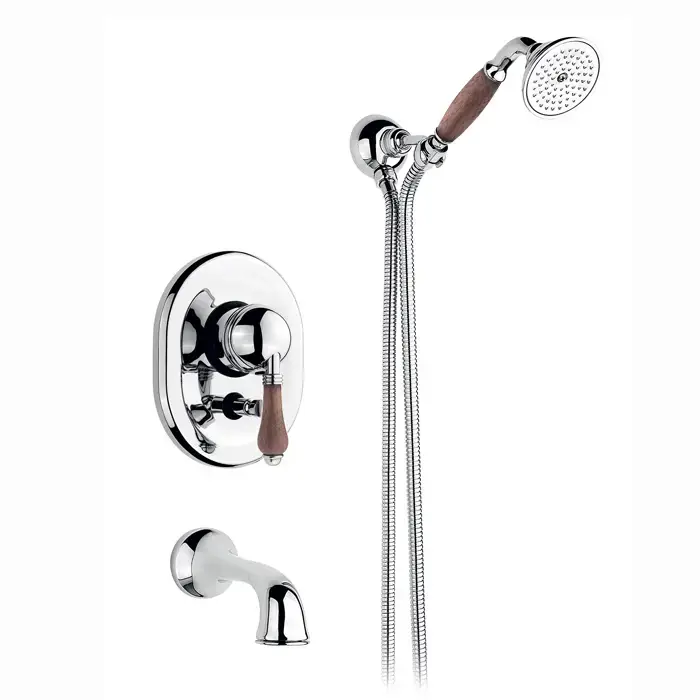 Nicolazzi Forest Смеситель для ванны однорычажный, встраиваемый, с изливом 160мм и ручным душем, ручки дерево, цвет: хром