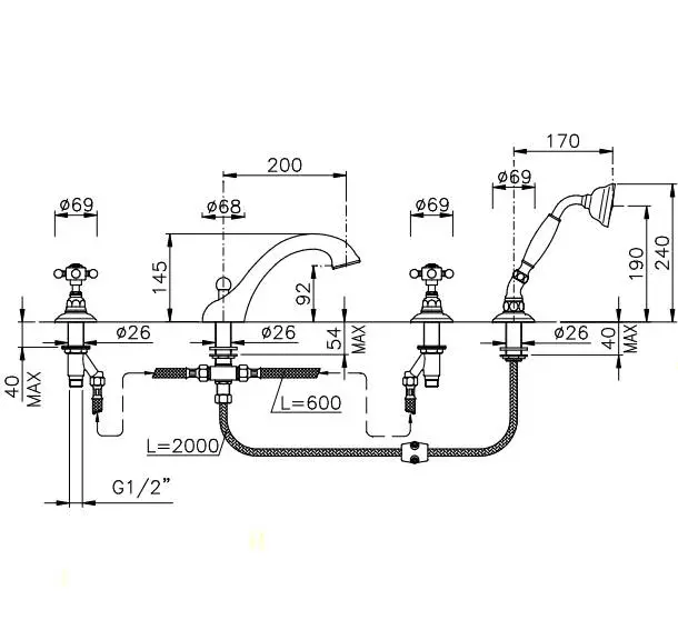 Nicolazzi Half Dome Смеситель для ванны на 4 отверстия, изливом 246мм и ручным душем, цвет: хром