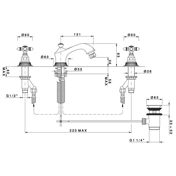 Nicolazzi Impero Смеситель для биде на 3 отверствия с донным клапаном, излив: 131 мм, цвет: хром