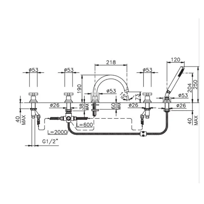 Nicolazzi M.Croce Смеситель на борт ванны на 5 отверстий, с ручным душем, излив: цвет: 218мм, хром