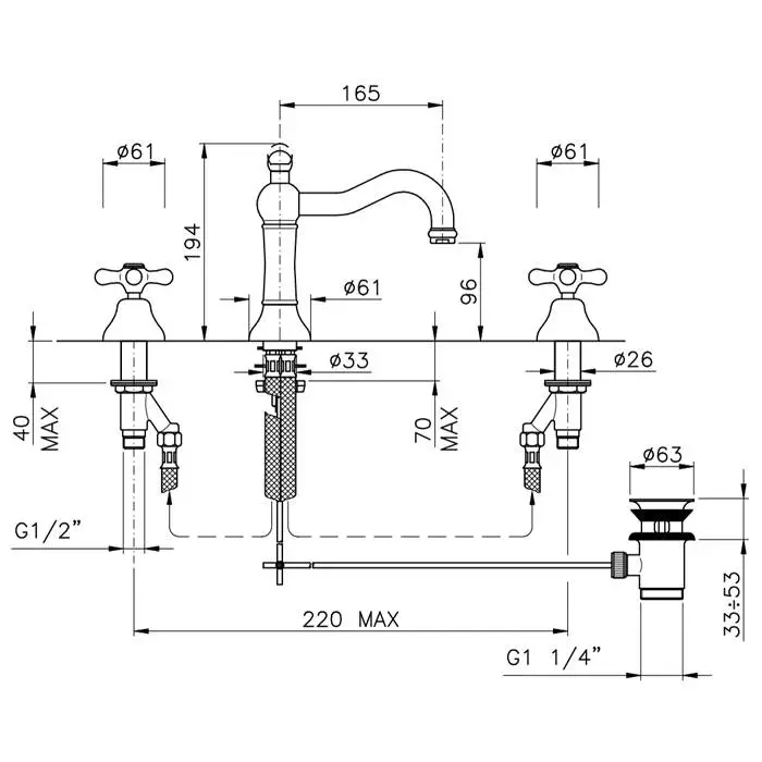 Nicolazzi Nuova Brenta Смеситель для раковины на 3 отверстия, с донным клапаном, излив: 165мм, цвет: хром