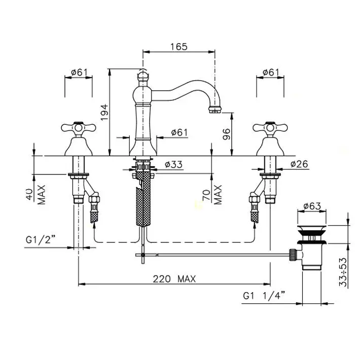 Nicolazzi Nuova Brenta Смеситель для раковины на 3 отверстия, с донным клапаном, излив: 165мм, цвет: хром