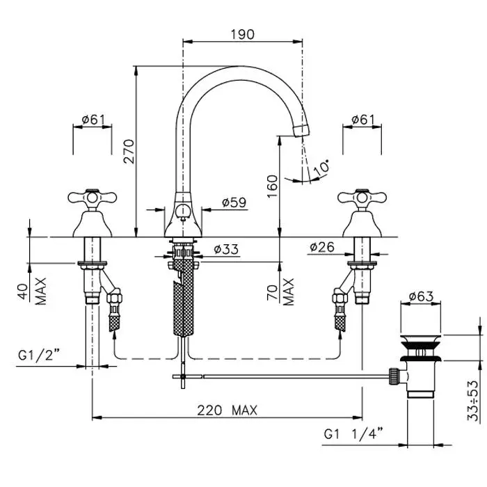 Nicolazzi Nuova Brenta Смеситель для раковины на 3 отверстия, с донным клапаном, излив: 165мм, цвет: хром