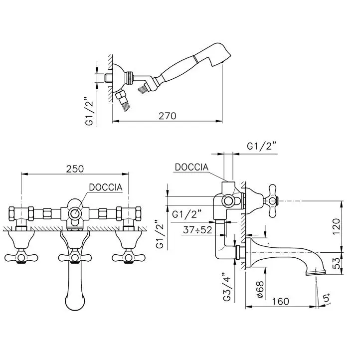 Nicolazzi Nuova Brenta Смеситель для ванны с 3мя ручками, настенный, с душевой лейкой, излив: 178мм, цвет: хром