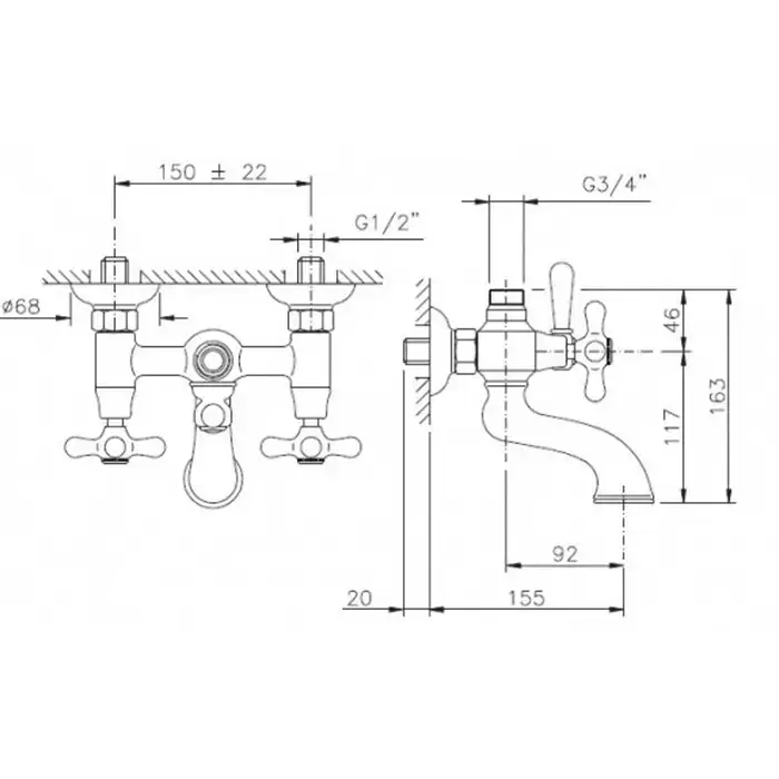 Nicolazzi Nuova Brenta Смеситель для раковины с 2мя ручками, настенный, излив: 160мм, цвет: хром