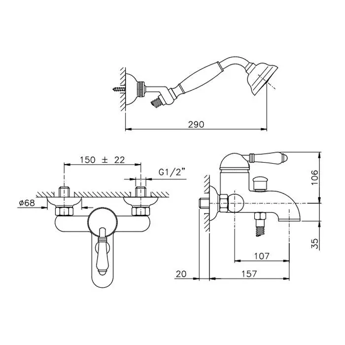 Nicolazzi P.m. Blanc A Смеситель для ванны однорычажный, настенный, с ручным душем, ручки состаренная керамика, цвет: хром
