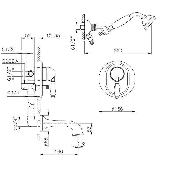 Nicolazzi P.m. Blanc A Смеситель для ванны однорычажный, встраиваемый, с изливом 160мм и ручным душем, ручки состаренная керамика, цвет: хром