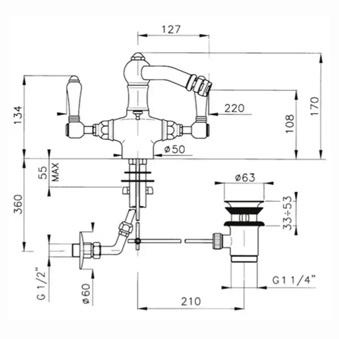 Nicolazzi El Capitan Смеситель для биде с 2мя ручками, на 1 отв., с донным клапаном, излив 127мм, цвет: Bronze Plated