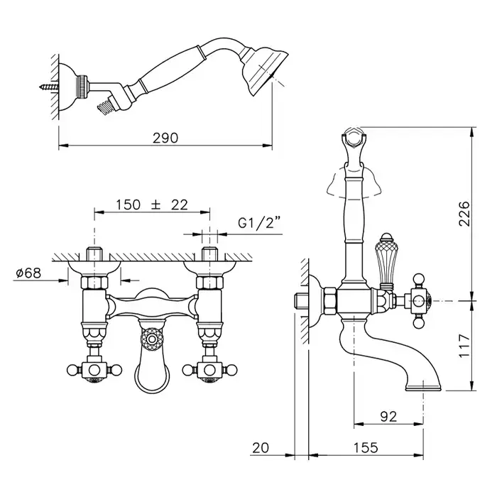 Nicolazzi Petit Mont Blanc Смеситель для ванны с душем duplex настенный на 2 отверстия, излив: 155 мм, цвет: Bronze Plated