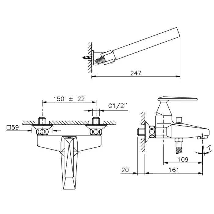 Nicolazzi Vincent Смеситель для ванны на 2 отверстия, настенный, с душевой лейкой, цвет: хром