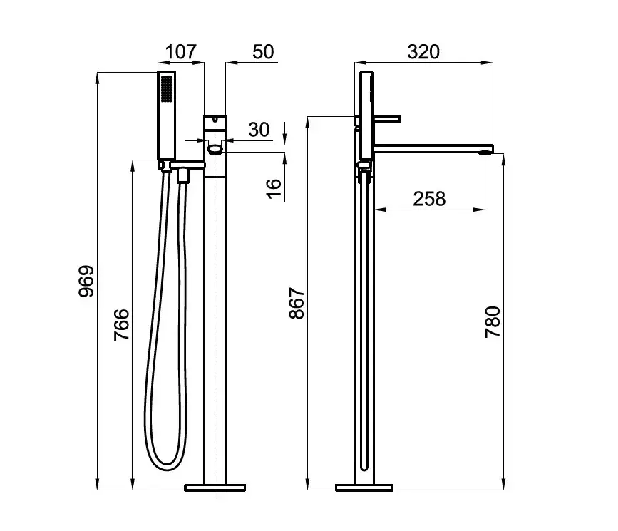 NOKEN CONCEPT Напольный смеситель для ванны/душа, с гибким шлангом и ручным душем, хром