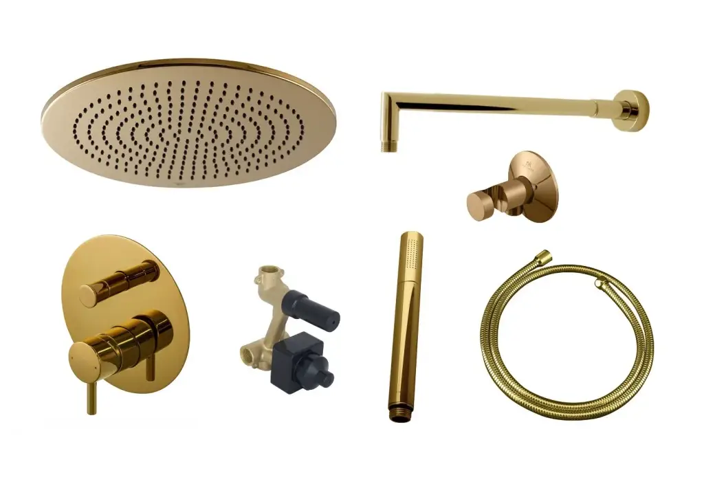 NOKEN PACK RONDO Комплект для душа с верхним душем Ø30 см, смесителем, ручной лейкой, gold