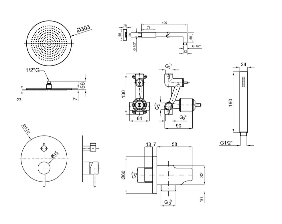 NOKEN PACK RONDO SINGLE LEVER Душевой комплект с верхним душем Ø30 см, смесителем, хром