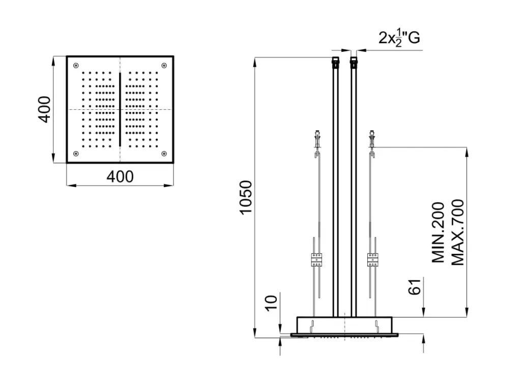 NOKEN SQUARE Верхний душ встраиваемый в потолок 40 см, дождь и каскад, 21 и 16 л/мин, INOX ESPEJO