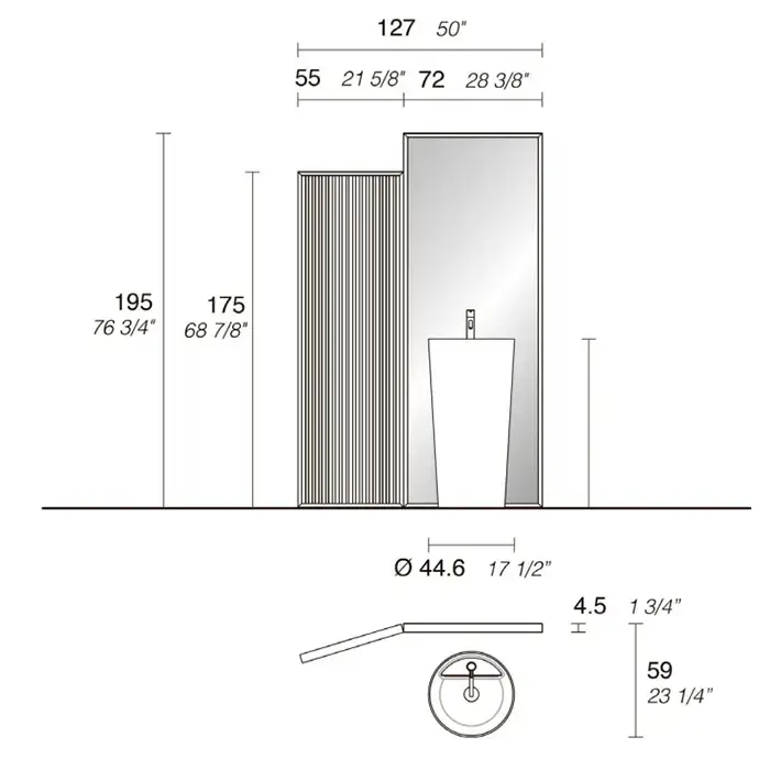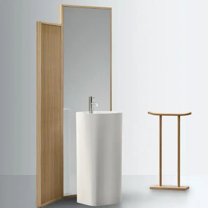 NOORTH milldue edition AZUMA Комплект 127см из напольной ширмы в матовом шпоне с зеркалом и напольной раковины из Cristalplant, цвет: rovere mezza fiamma-7777 / белый матовый
