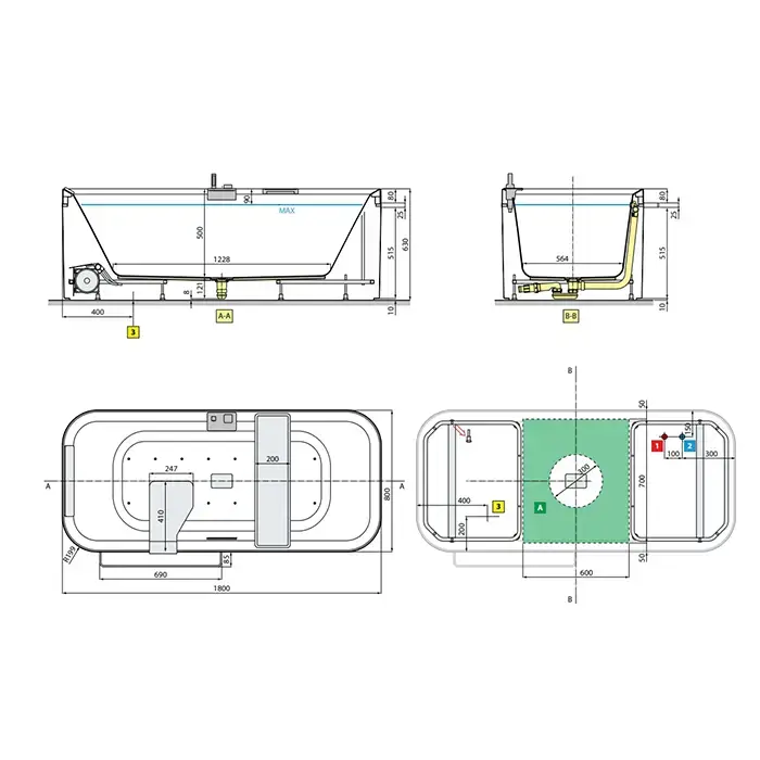 NOVELLINI DIVINA F Ванна отдельностоящая 1800х800х630 мм., с полкой и полотенцедержателем, смесит, слив-перел, подгол черн, фурн хром, цвет белый мат