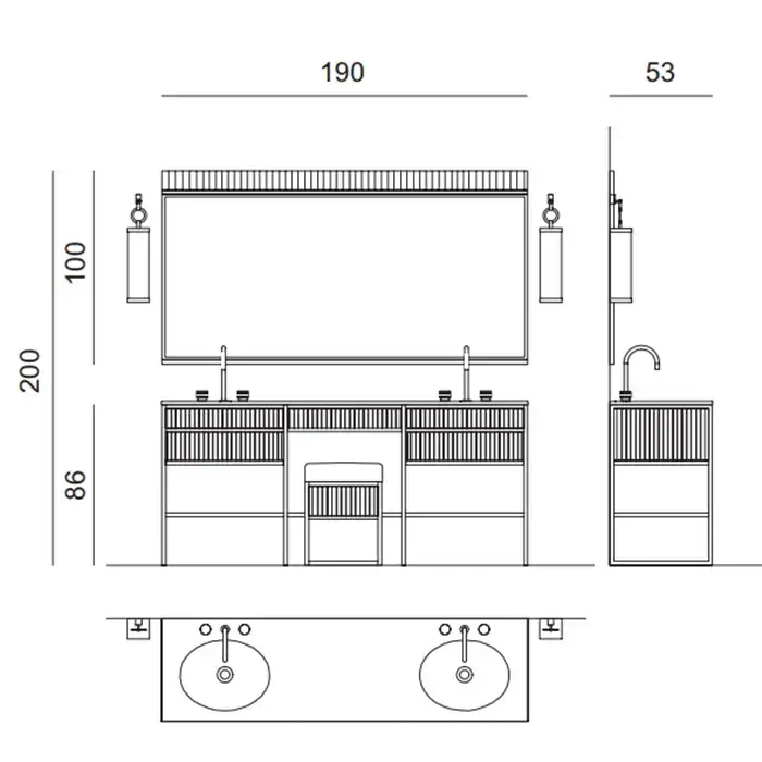 OASIS ACADEMY Консоль под 2 раковины 1900х530х840 мм., напольная, 3 ящика, 2 полки, структура золото, отделка Ribbed Glass Cemento глянцевый