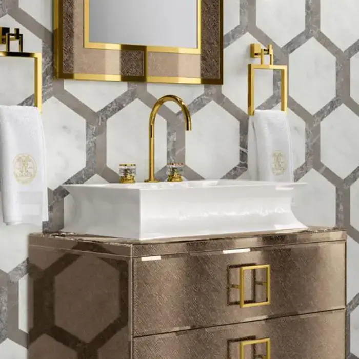 Oasis Academy Комплект мебели 66х53х84см., напольный, 1 ящик, 1 полка, столешница мраморная, с раковиной 54х43см., зеркало 66х100см., цвет: золото/Bianco Carrara