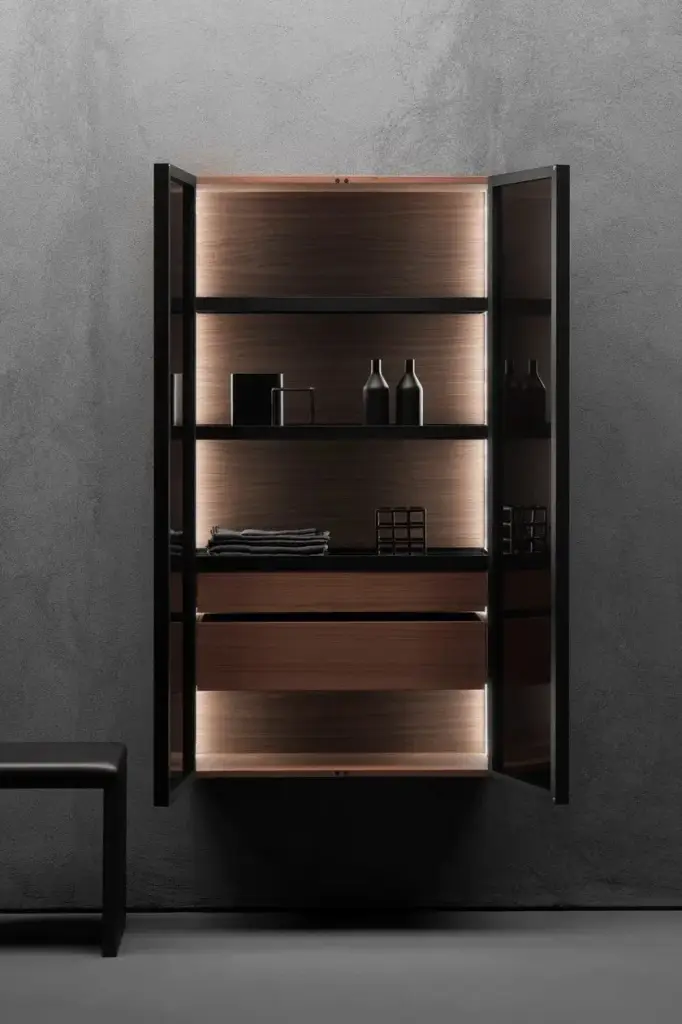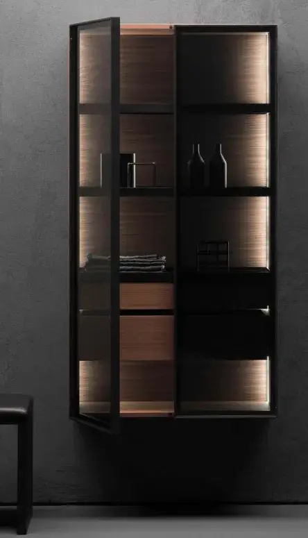 Пенал с подсветкой, 2 дверцами, стеклянными полками и 2 внутренними ящиками 80*35*150h Burned wallnut-N6/Alluminio nero opaco/smoke grey glass