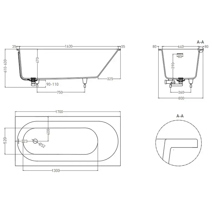 Salini Ornella Kit Ванна 170х70х60см., встраиваемая, донный клапан, сифон, щелевой слив-перелив, S-Sense, цвет: белый