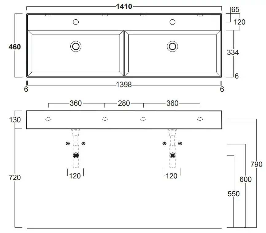 SIMAS AGILE Раковина двойная подвесная 141х46 см, с переливом, с 2 отв под смеситель,цвет белый