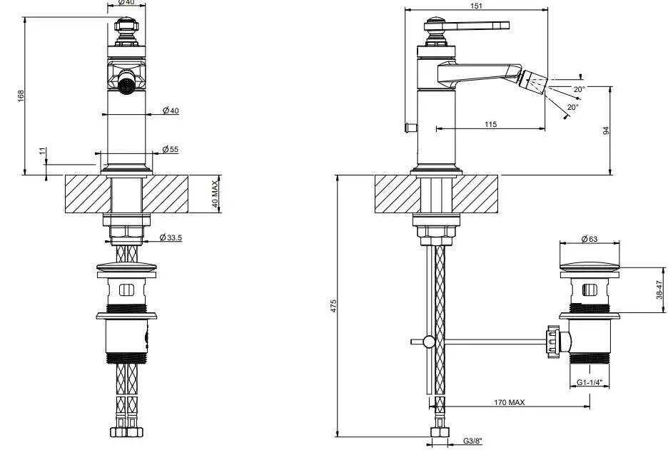 Gessi Venti20 Смеситель для раковины на 3 отверстия, высота излива 168 мм., в комплекте с донным клапаном, цвет: хром