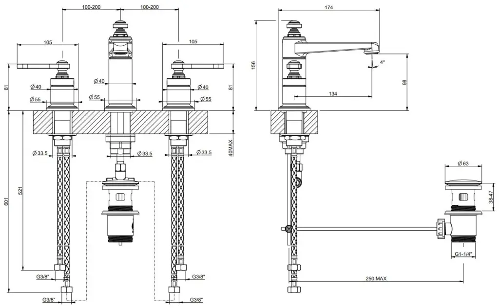 Gessi Venti20 Смеситель для раковины на 3 отверстия, высота излива 168 мм., в комплекте с донным клапаном, цвет: хром