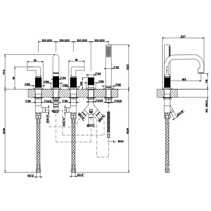 Gessi Inciso+ Смеситель для ванны на 4 отверстия для наполнения через слив-перелив, переключатель, шланг 1,50 м, цвет: black XL