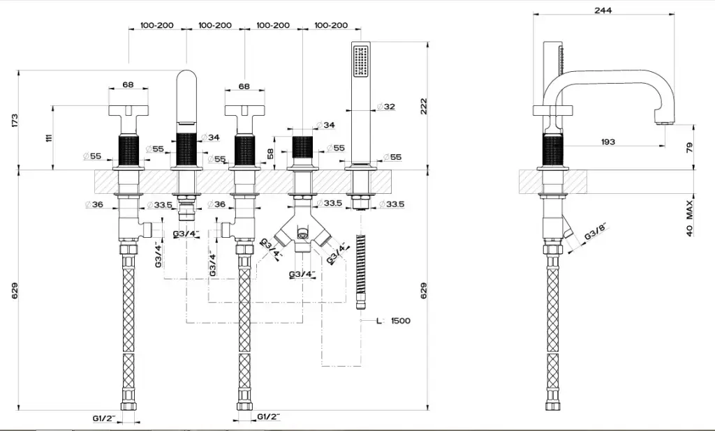 Gessi Inciso+ Смеситель для ванны на 4 отверстия для наполнения через слив-перелив, переключатель, шланг 1,50 м, цвет: black XL