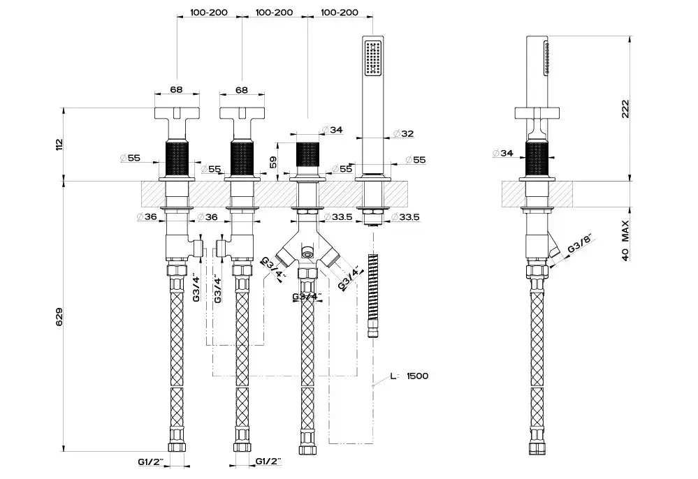 Gessi Inciso+ Смеситель для ванны на 4 отверстия для наполнения через слив-перелив, переключатель, шланг 1,50 м, цвет: black XL