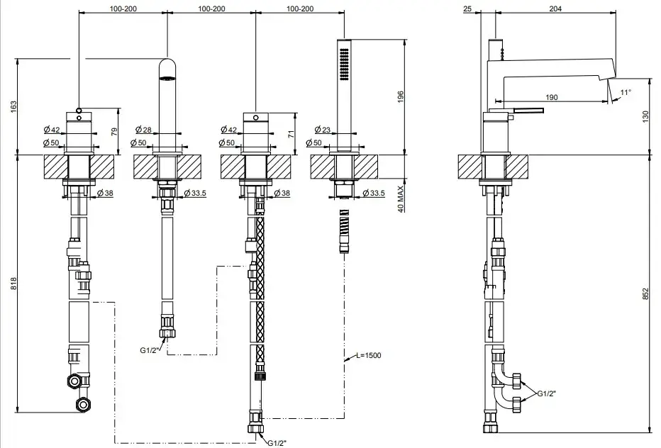 Gessi Ingranaggio Смеситель для ванны на 4 отверстия с каскадным изливом, девиатор, шланг , лейка, цвет: хром
