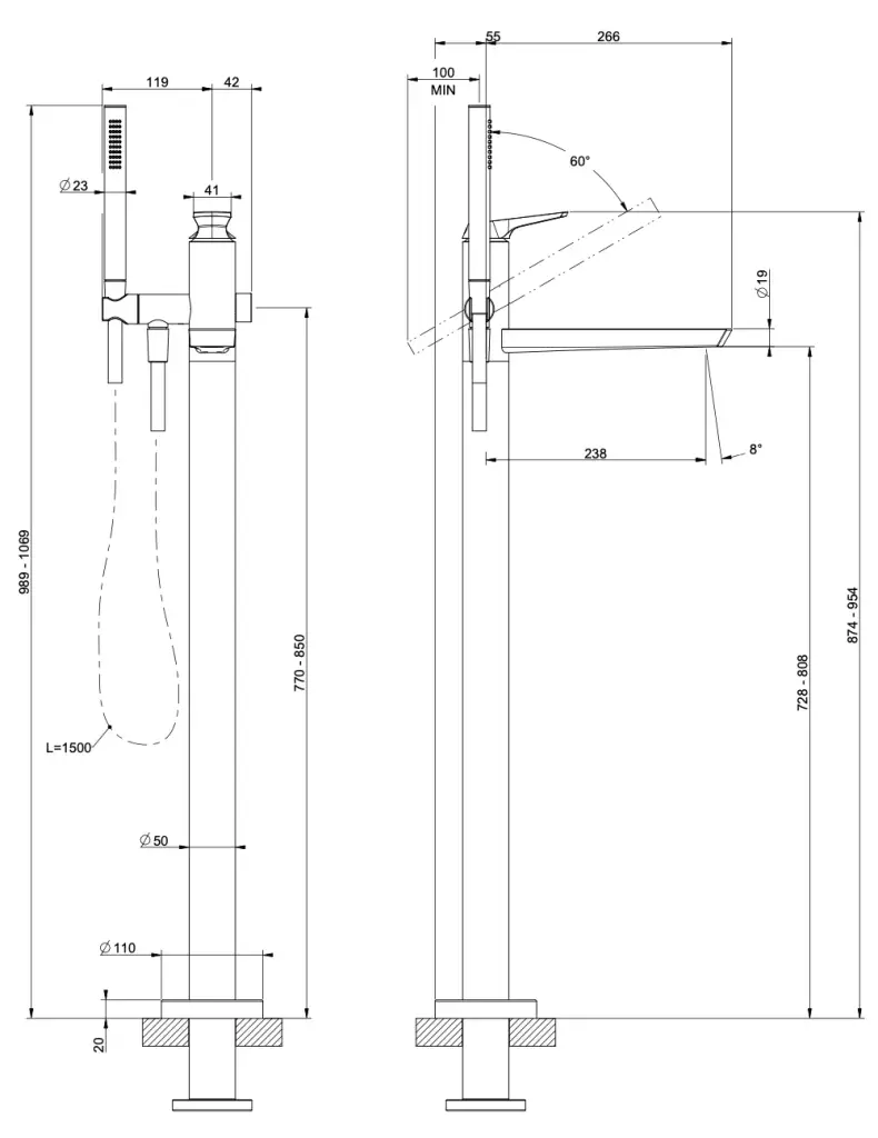 Gessi Ventaglio Внешняя часть напольного смесителя для ванны с перекл и ручным душем , цвет: хром