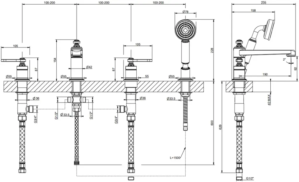 Gessi Venti20 Смеситель для ванны напольный, двухвентильный, с ручным душем и шлангом 1500 мм., внешняя часть, цвет: хром