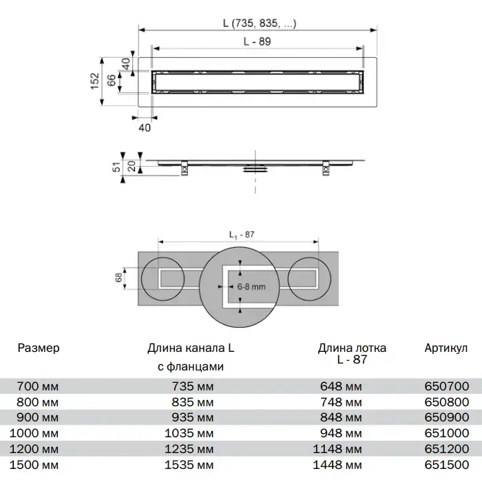 TECE drainline, Комплект для установки дренажного канала 700 мм из нержавеющей стали, с лотком под плитку