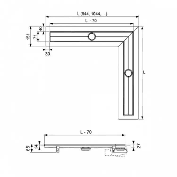 TECE Лоток угл. "plate", 1500х1500 мм, основа для плитки, нерж. сталь, полированная