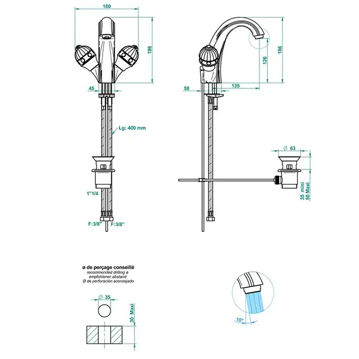 THG AMBOISE LAPIS LAZULI Смеситель для раковины на 1 отверстие, с донным клапаном, вставки лазурит, цвет полированное золото