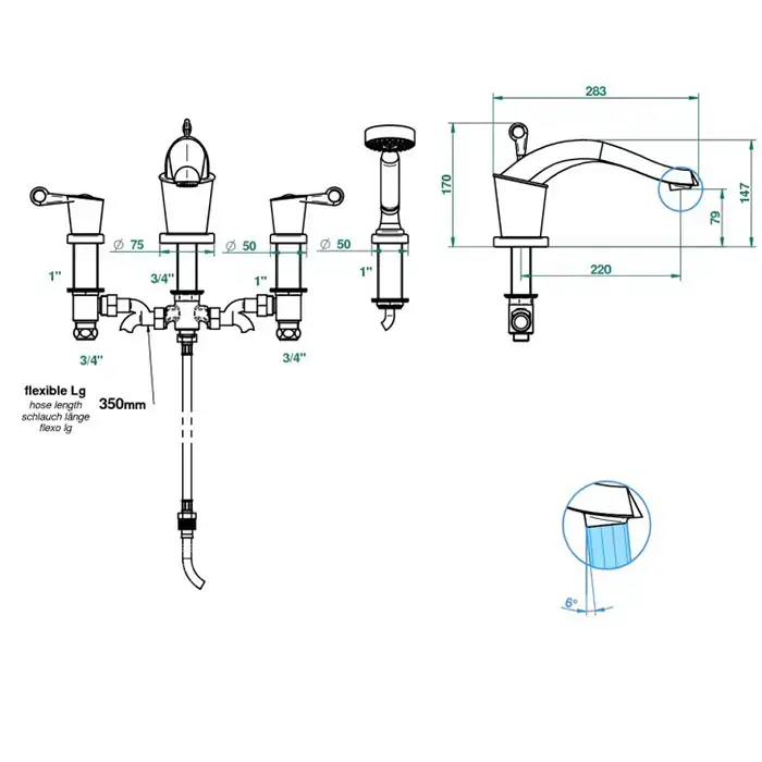 THG BAGATELLE PIERRE NOIRE MANETTES Смеситель для для установки на борт ванны на 4 отверстия, с ручным душем, ручки черные, цвет полированное золото