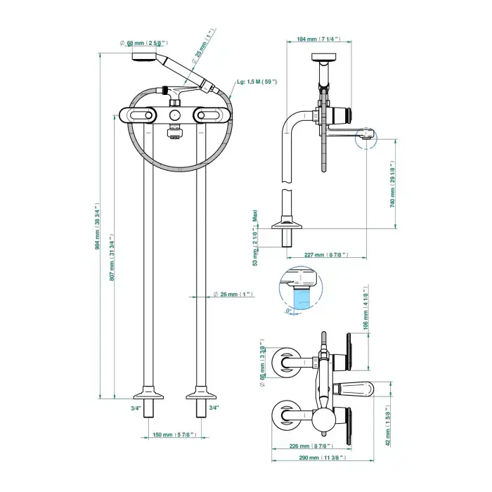 THG CORVAIR A MANETTES FIOR DI BOSCO Смеситель для ванны напольный, с ручным душем и шлангом 1500 мм., цвет хром