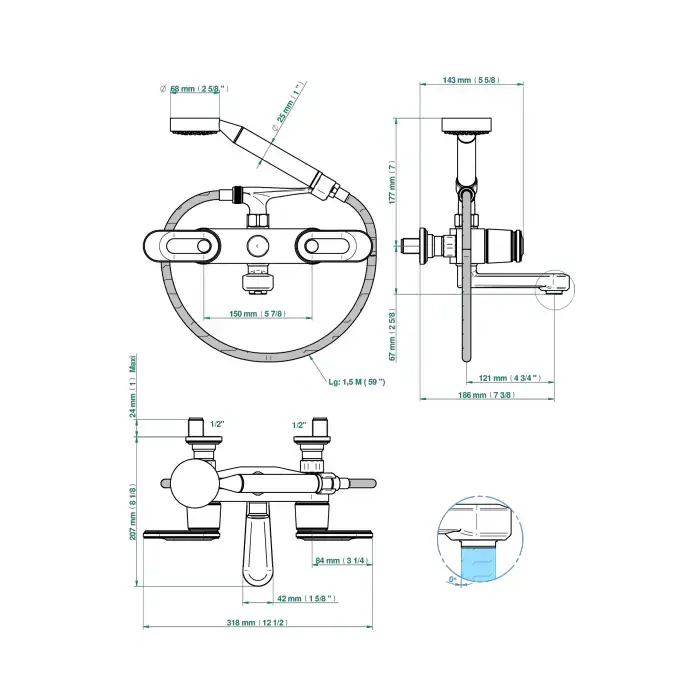THG CORVAIR A MANETTES FIOR DI BOSCO Смеситель на борт ванны на 5 отверстий, двойной, с ручным душем, цвет: хром