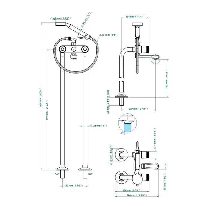 THG CORVAIR FIOR DI BOSCO Смеситель для ванны напольный, с ручным душем и шлангом 1500 мм., цвет: хром