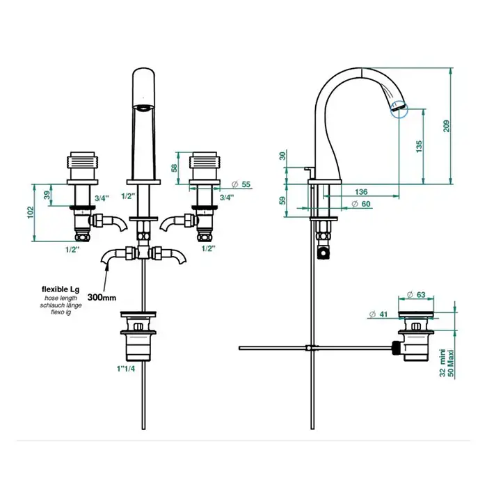 THG DIPLOMATE GROOVED RINGS Смеситель для раковины на 3 отверстия, с донным клапаном, цвет хром
