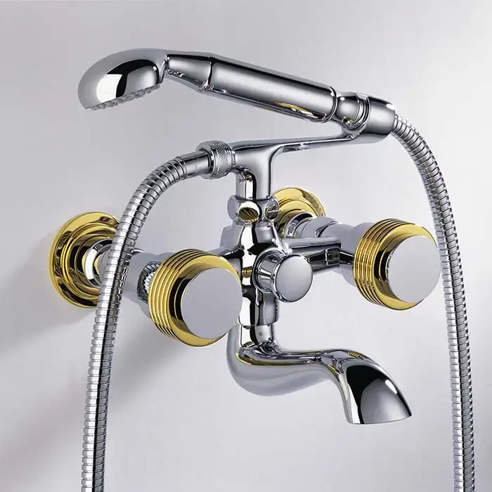 THG Diplomate grooved rings Смеситель для ванны, настенный монтаж, с ручным душем и шлангом 1500 мм., цвет: хром/золото