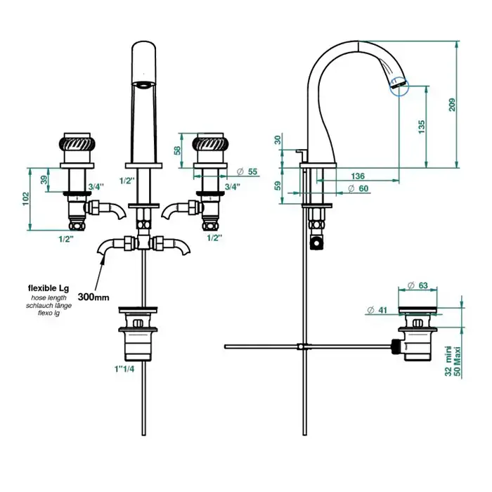 THG DIPLOMATE ROPED RINGS Смеситель для раковины на 3 отверстия, с донным клапаном, цвет хром/золото