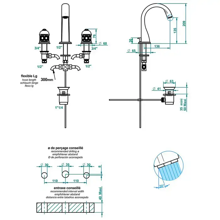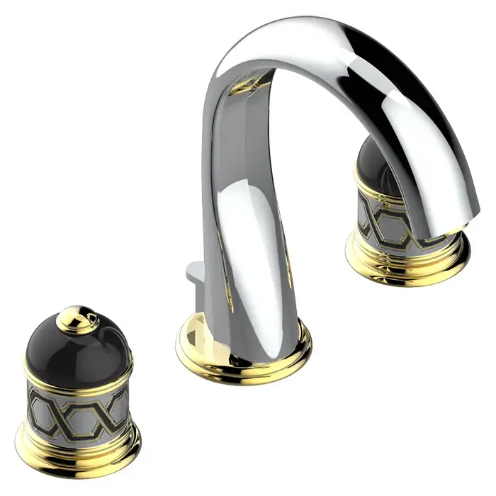 THG DUOMO Смеситель для раковины на 3 отверстия, с донным клапаном, декор Aranja, цвет никель/золото