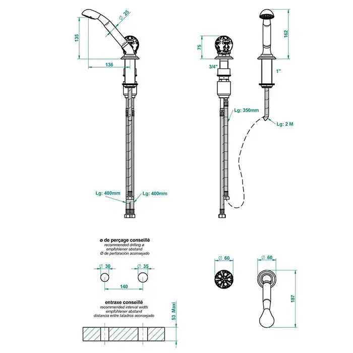 THG FLORE Смеситель на борт ванны на 2 отверстия, прогрессивный, с ручным душем, цвет хром