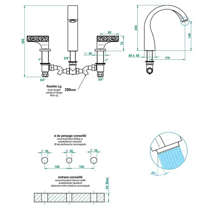 THG GINKGO Смеситель на борт ванны на 3 отверстия, без ручного душа, цвет полированное золото