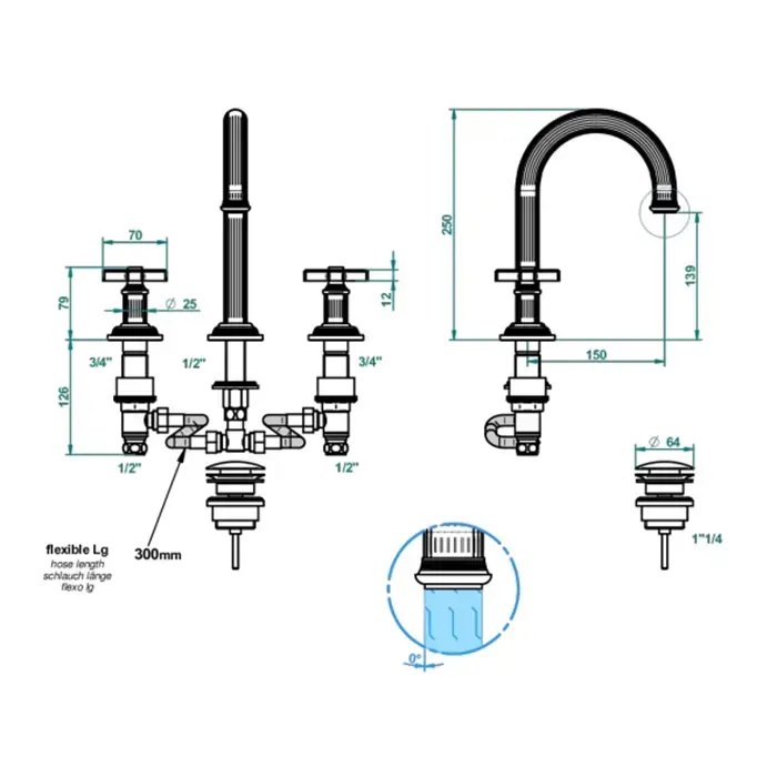 THG Grand Central Croisillon Metal Смеситель для раковины, на 3 отв., в комплекте с донным клапаном, цвет: Matt brass color PVD