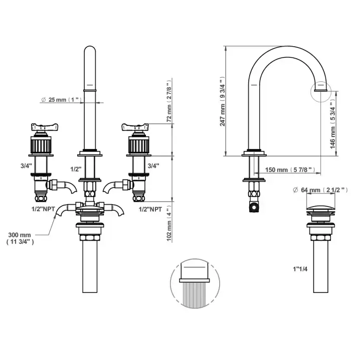 THG HAMPTONS Смеситель для раковины на 3 отверстия, в комплекте с донным клапаном, цвет хром